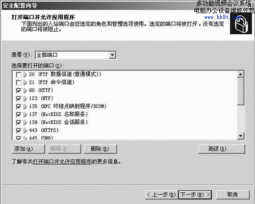 進入“網(wǎng)絡(luò)安全”對話框,在此可配置已經(jīng)選中的服務(wù)器角色和其他Windows 2003服務(wù)所使用的端口。點擊“下一步”按鈕后,在“打開端口并允許應(yīng)用程序”對話框中開放需要的端口(圖2)。如FTP服務(wù)器需要的“20和21”端口,IIS服務(wù)需要的“80”端口等。只要在列表框中選擇要開放的端口選項即可,最后確認端口配置。