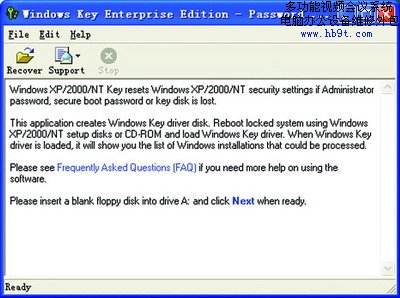 Windows KEY運(yùn)行后,主界面如圖3所示,在軟驅(qū)中放一張空白軟盤(注意:必須是空白軟盤,否則不能繼續(xù)操作),生成一張恢復(fù)系統(tǒng)管理員的密碼盤,其中共3個(gè)文件,分別是Txtsetup.oem、Winkey.sys和Winkey.inf,共417KB,F(xiàn)在用Windows XP安裝光盤啟動(dòng)電腦,啟動(dòng)過程中按F6鍵讓系統(tǒng)采用第三方驅(qū)動(dòng)程序。此時(shí),放入該軟盤就會(huì)自動(dòng)跳到Windows KEY的界面。這時(shí)它會(huì)強(qiáng)行把a(bǔ)dministrator的密碼換成“12345”。當(dāng)你重新啟動(dòng)以后,就要求再次修改密碼。