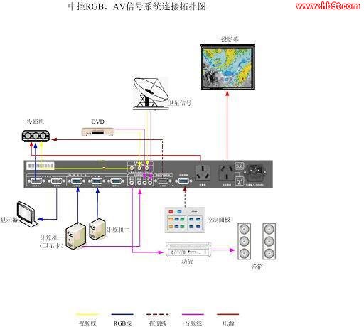 中控上臺式電腦、衛(wèi)星信號、DVD機(jī)的音頻輸入口分別接以上各設(shè)備的音頻。