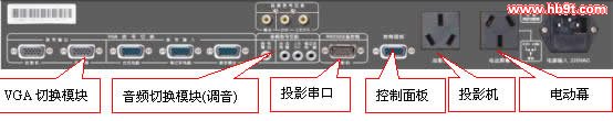 印有投影機(jī)的供電口為投影機(jī)供電\印有電動屏幕的端口控制電動屏幕的升降